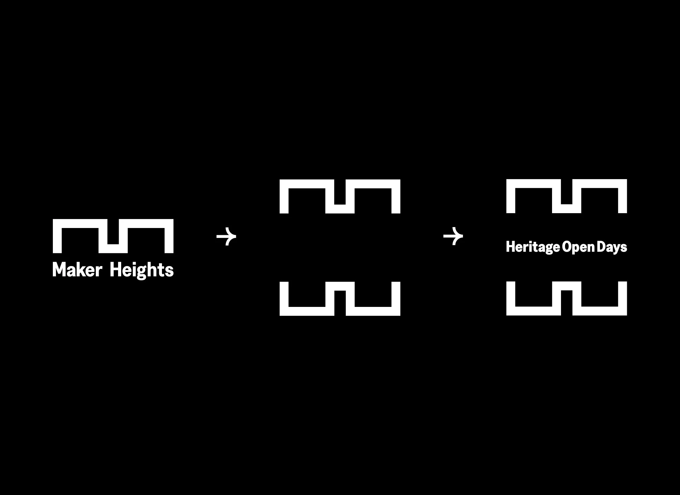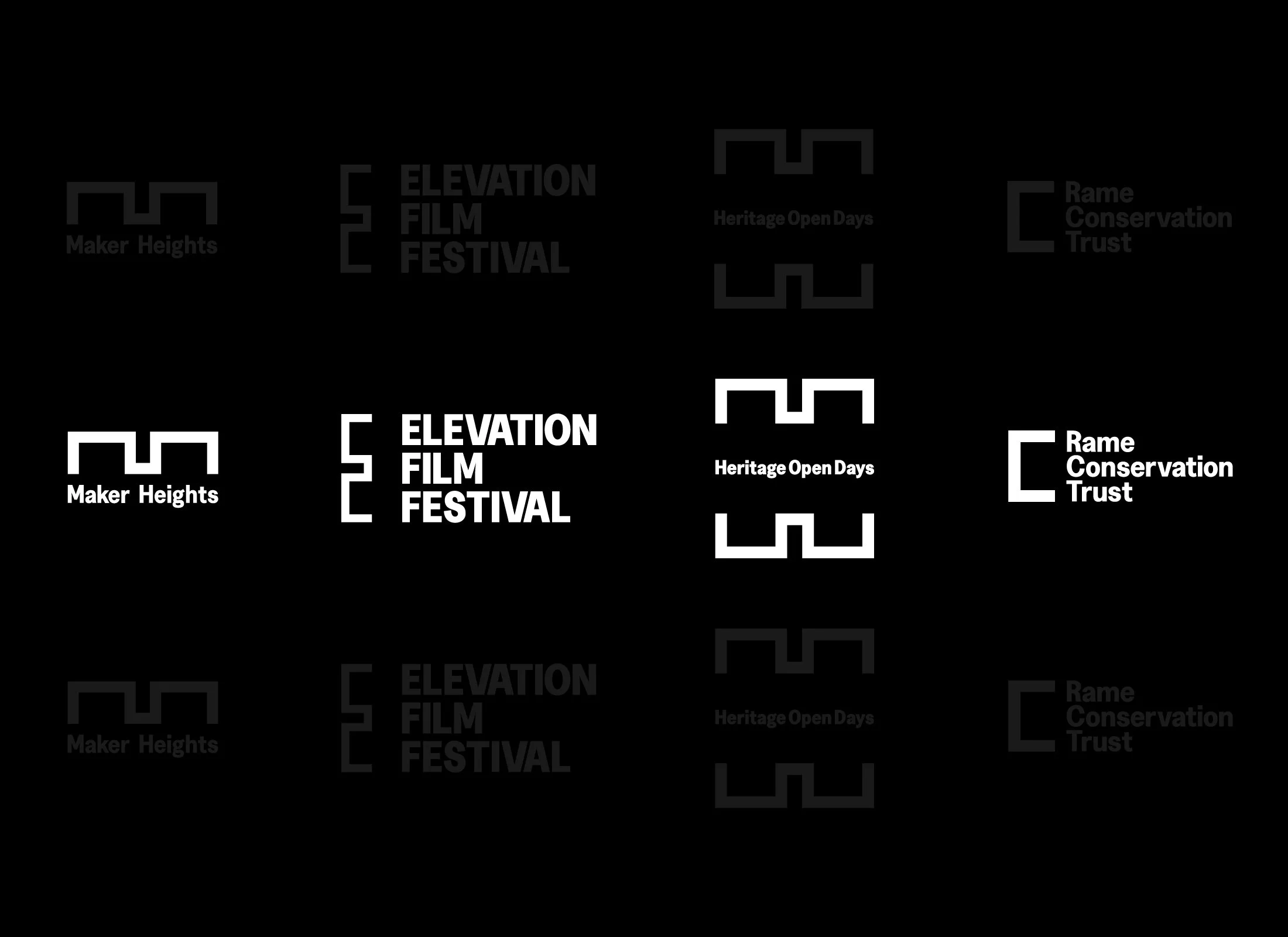The Maker marque is derived from the architectural plan of the Barrack Block, rooting the identity directly in the site’s fabric. Designed as a flexible graphic device, the ‘M’ can shift through negative space to reveal other letters — forming an ‘H’ for Heritage Open Days and an ‘E’ for the Elevation Film Festival. For the Rame Conservation Trust, the mark is split to create a ‘C’. The result is a simple form with a life beyond itself — a mark that adapts across Maker’s programme while remaining unmistakably part of the same visual family.