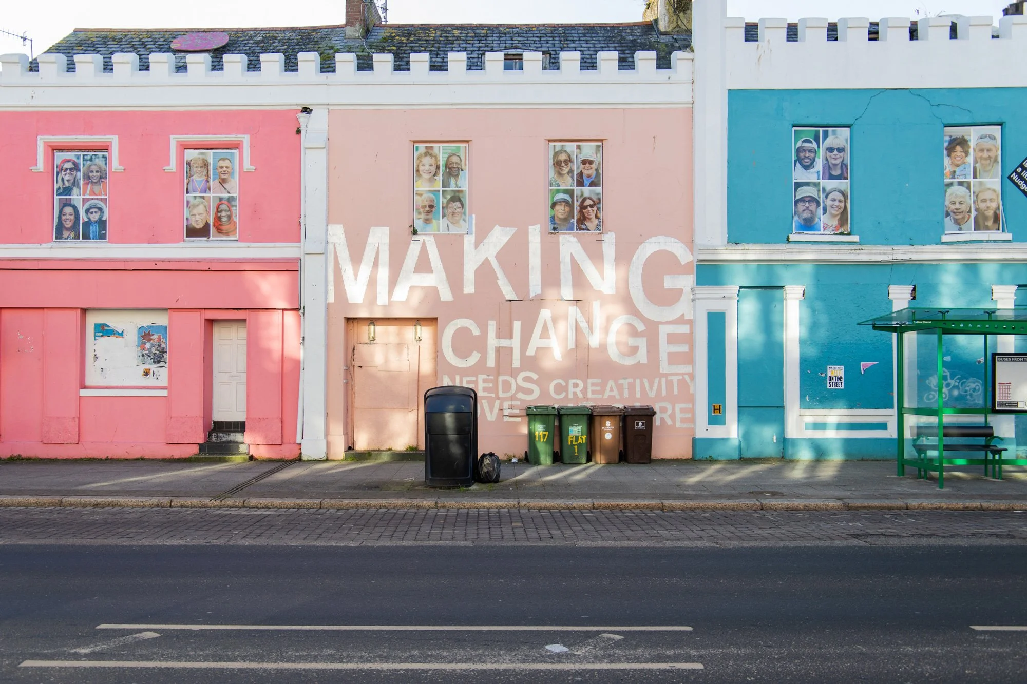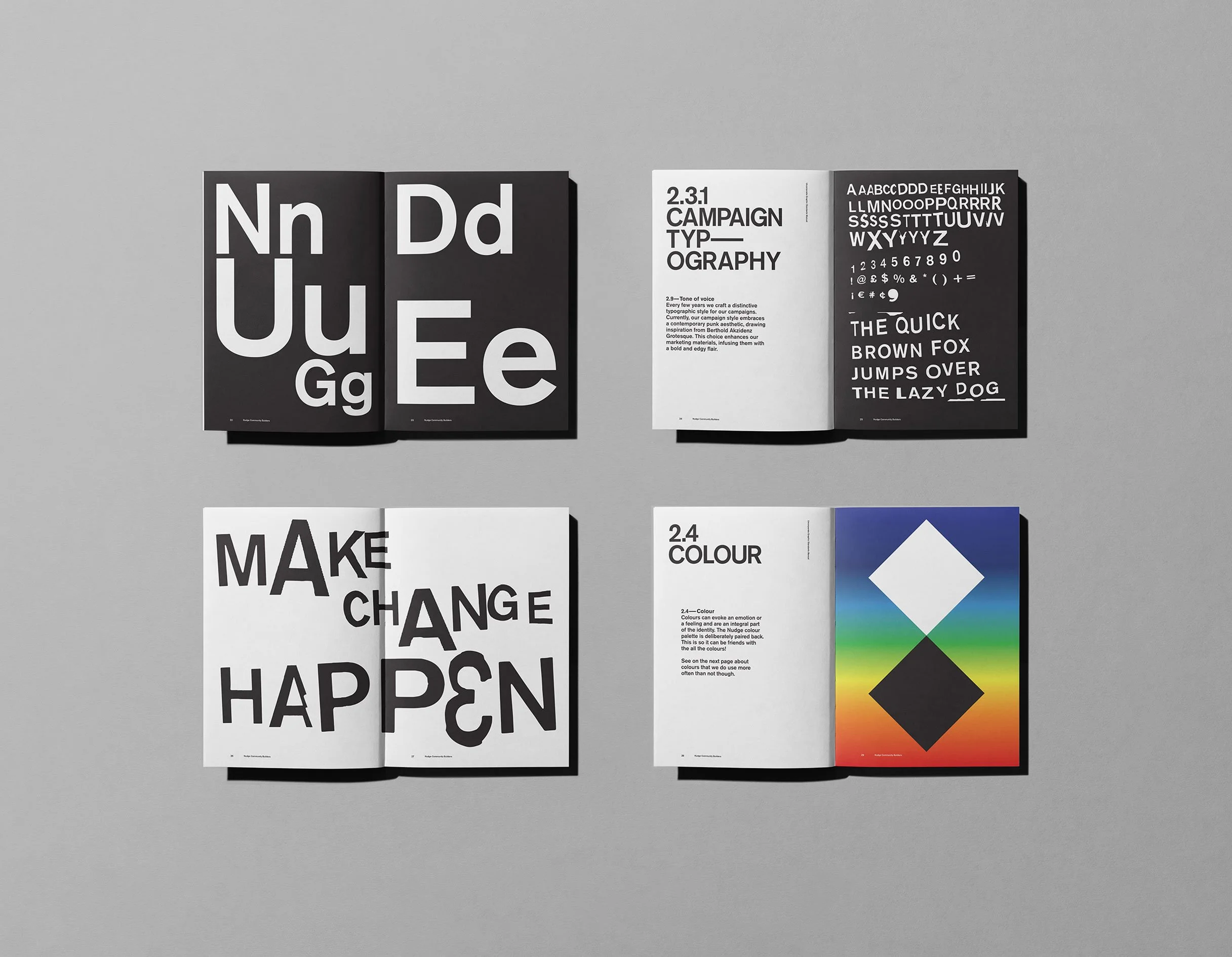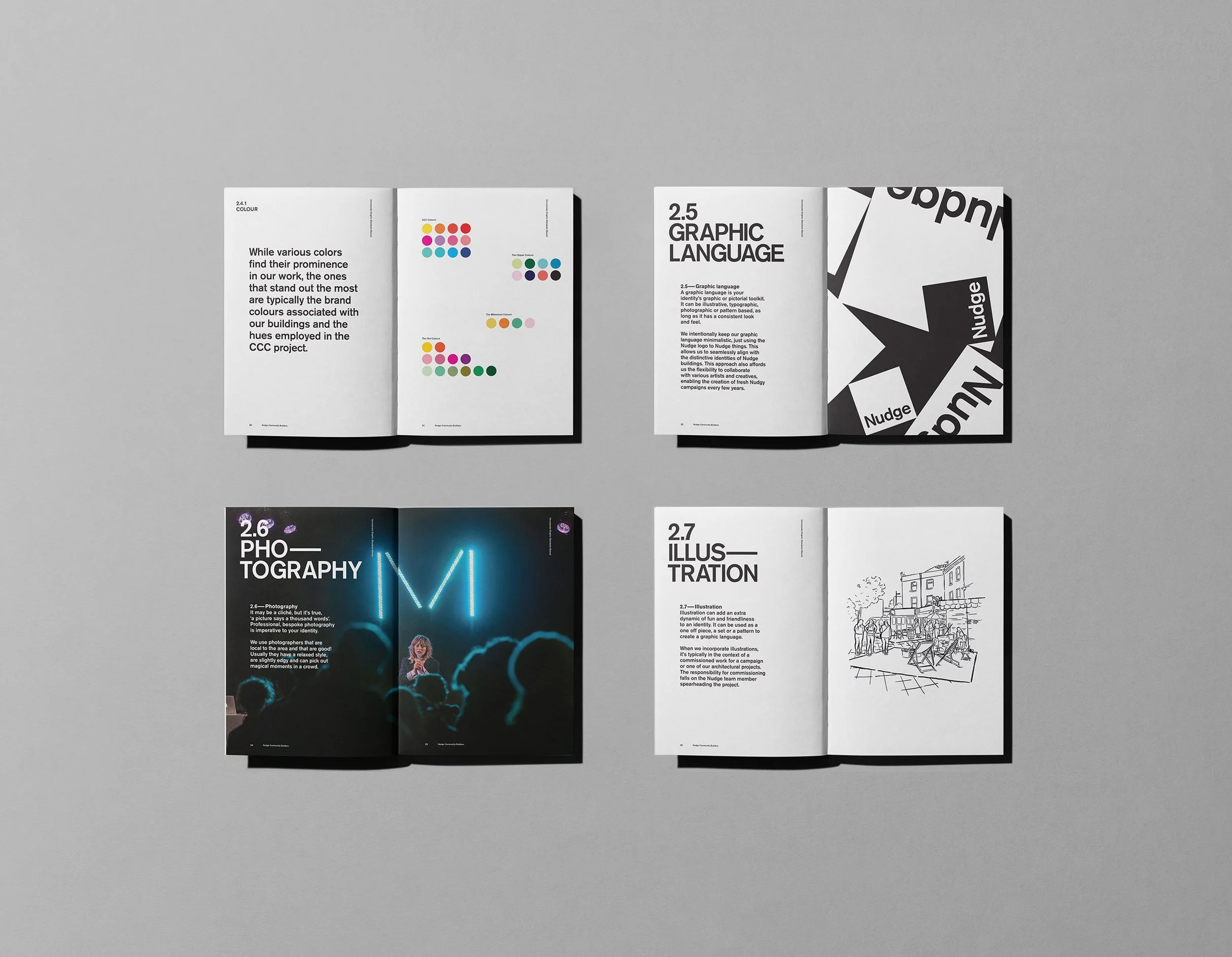 Since then, our relationship has grown alongside Nudge’s impact. Rather than a one-off project, this has been an ongoing partnership — supporting the organisation through every stage of its evolution. From individual buildings to wider initiatives, we’ve developed a series of distinct but connected identities — each one rooted in its specific place and purpose, but all clearly part of the Nudge ecosystem. The approach is intentionally grounded and high-impact: clear messaging, confident typography, and visual language that works in the real world — on buildings, signage, print and everyday materials.