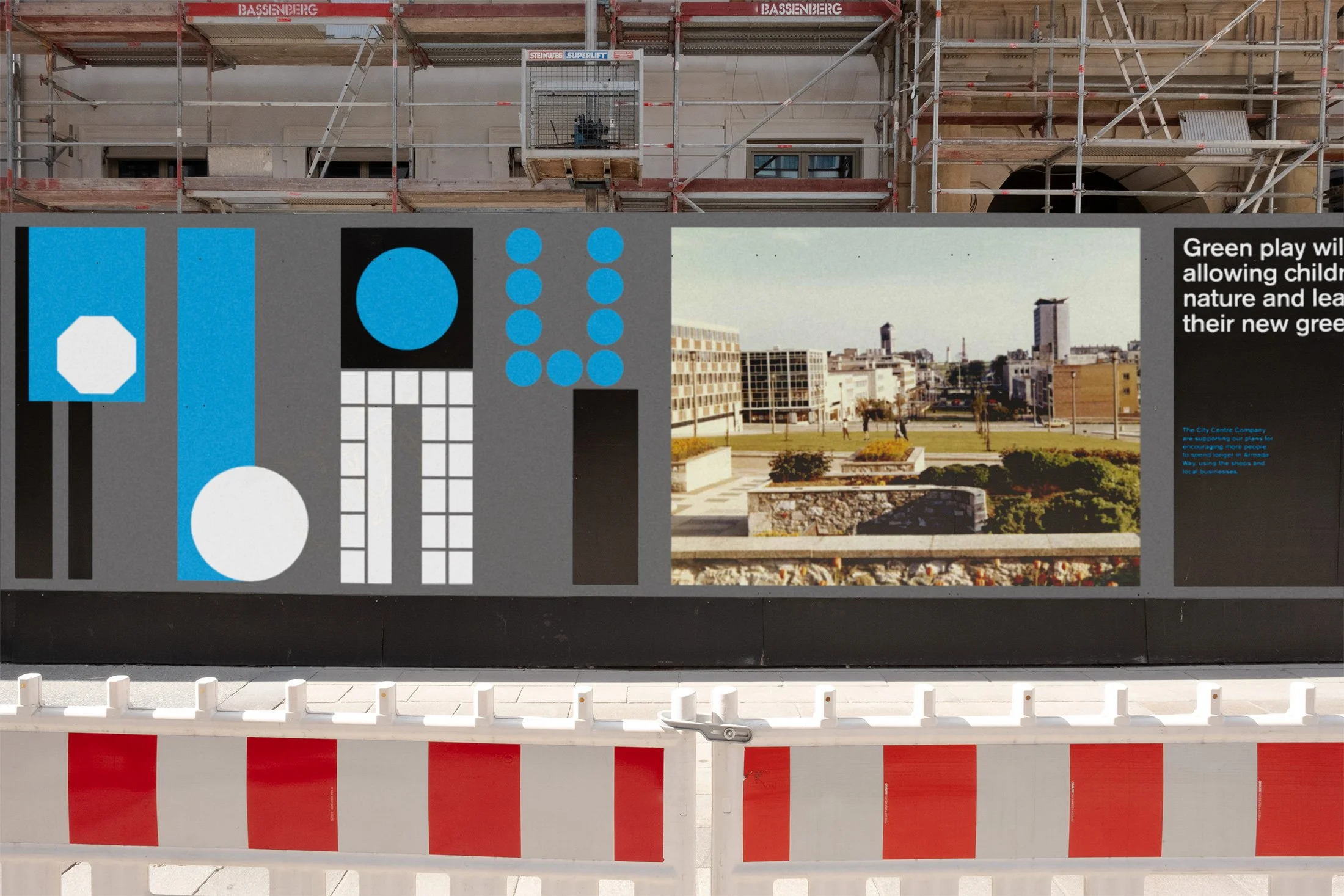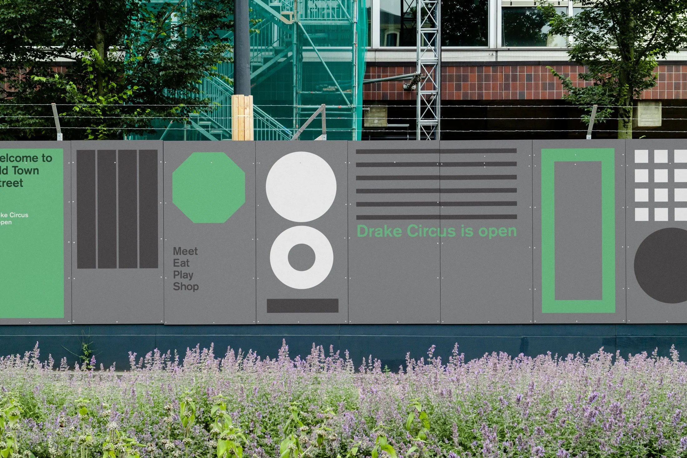 Using this as a starting point, we developed a modular visual language where graphic elements could interlock, expand and reconfigure — allowing the campaign to adapt seamlessly across multiple sites while retaining a strong sense of cohesion.